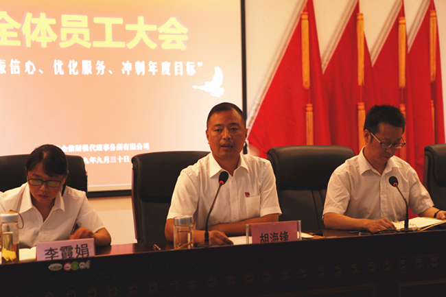 2019年9月30日,公司在五樓報告廳召開“提振信心、優化服務、沖刺年度目標”主題員工大會,全體員工50余人參加會議,公司總經理胡海鋒主持會議并做重要講話。