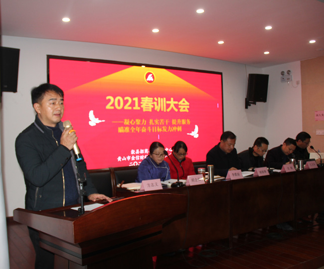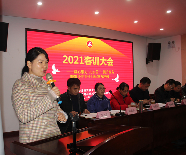 2021年2月26日,中心召開2021年度全體職工春訓大會,會議首先對2020年度優秀班組和個人進行表彰,以鼓勵他們在企業服務、中心發展方面做出的巨大貢獻。財稅服務二組、項目發展部獲得“優秀班組獎”,李霞娟、曾笑青獲得“優秀經理(組長)獎”,楊鳳琴、胡武星、柯淼、王衛兵、李思凱等5人獲得“優秀員工獎”。中心主任胡海鋒、副主任汪銘為優秀班組和個人頒發獎狀和獎金。
