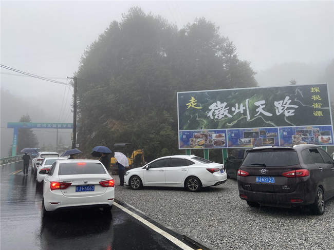 上午10點,抵達徽州天路海拔最高處的大峰尖山頂,天路名不虛傳,加之細雨綿綿,呈現(xiàn)出云霧繚繞,樹木、山峰若隱若現(xiàn)的情景,宛如瓊瑤仙境,員工們都不由得拿出手機,記錄沿途的神奇、美麗的風景。