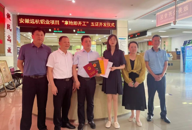 6月2日,安徽遠杭鋁業科技有限公司的年產8萬噸新型鋁型材智能化生產項目在政府有關部門的大力支持下,一次性取得《土地不動產權證書》、《修建性詳細規劃方案批復》《建設用地規劃許可證》、《建設工程規劃許可證》及《建筑工程施工許可證》五本證件,實現“拿地即開工”,成為我縣第一個“五證齊發”的典型案例。