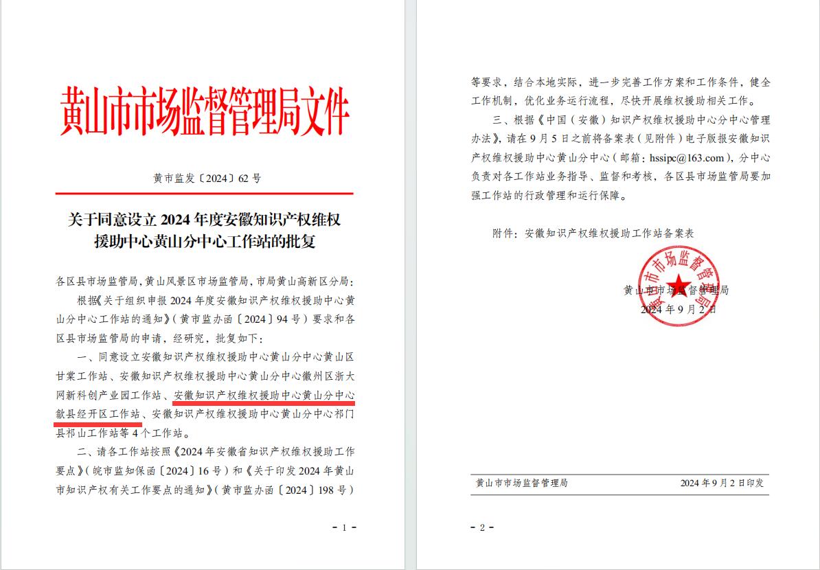 9月2日,黃山市市場監督管理局正式批復,批準安徽香寧眾創科技服務有限公司成立安徽知識產權維權援助中心黃山分中心歙縣經開區工作站。
